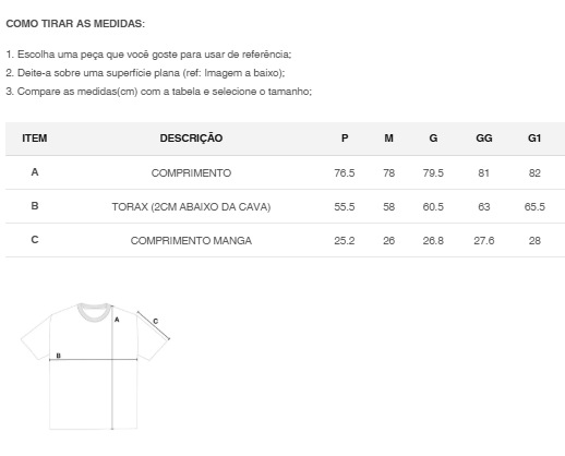 Camiseta 100% algodão com gramatura de 160g (Meia Malha 30/1 Penteado), macia e confortável para o uso diário.